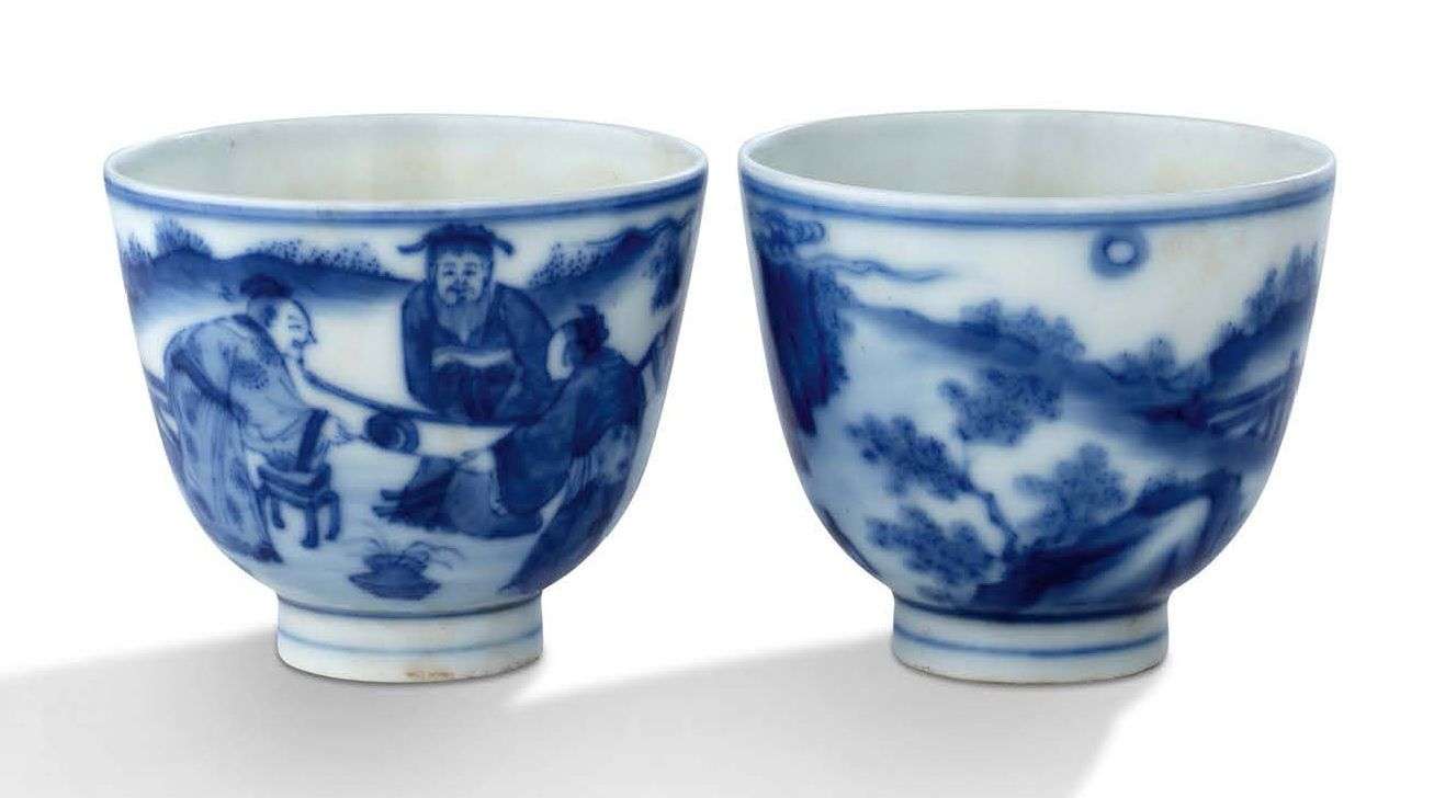Paire de coupes à vin en porcelaine bleu-blanc, reposant sur un court pied circulaire, décorées de lettrés admirant un rouleau peint dans un jardin. Marque Kangxi à six caractères en kaishu en bleu sous couverte sur la base de chaque.