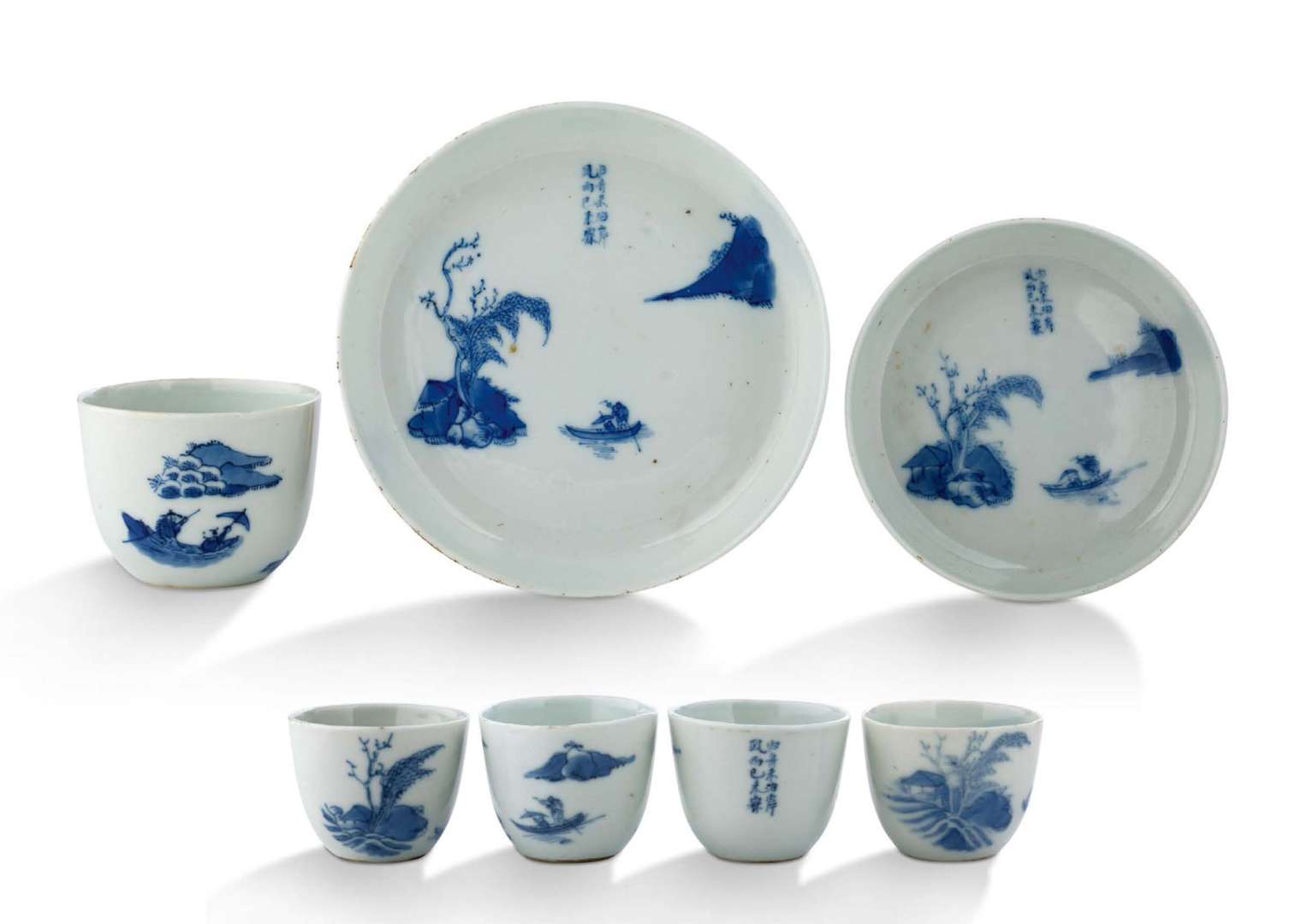 Ensemble à thé en porcelaine bleu-blanc composé d'un grand et d'un petit plateaux, d'une grande coupe et de quatre petites coupes. L'ensemble à décor d'une composition mettant en scène deux personnages naviguant entre des îles. L'ensemble est complété par quelques vers d'un poème. Marque Noi Phu (« Palais Intérieur ») en bleu sous couverte sur la base.