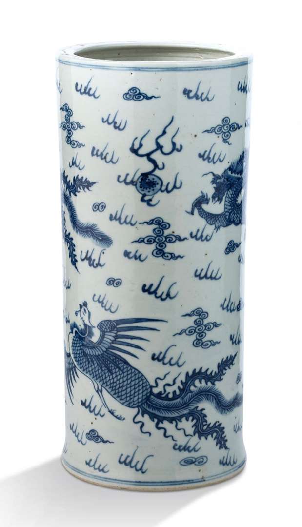 Vase cylindrique en porcelaine bleu-blanc à décor de dragons et phénix parmi les nuages et les flammes.