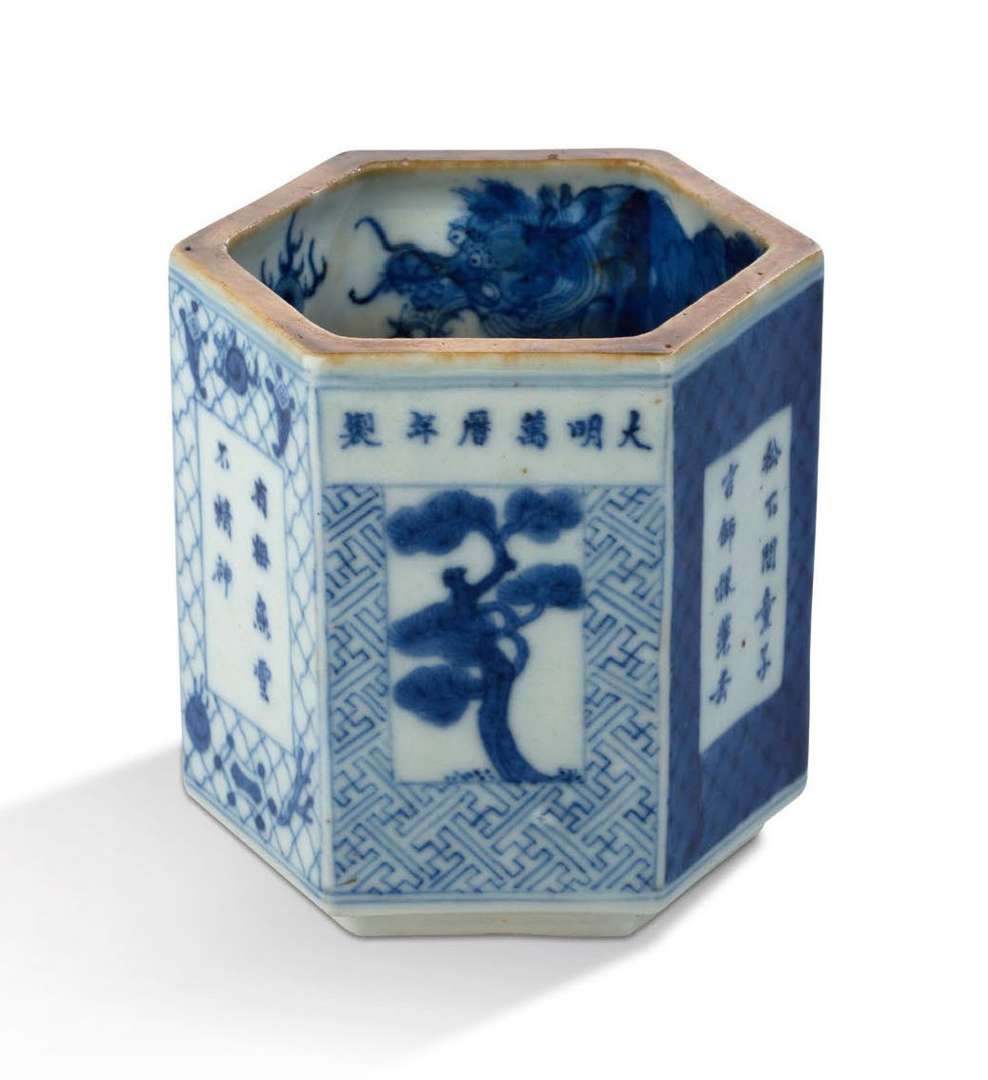 Porte-pinceaux hexagonal en porcelaine bleu-blanc, dont trois faces à décor des Trois Amis de l'Hiver (prunus, bambou et pin) alternant avec des poèmes.