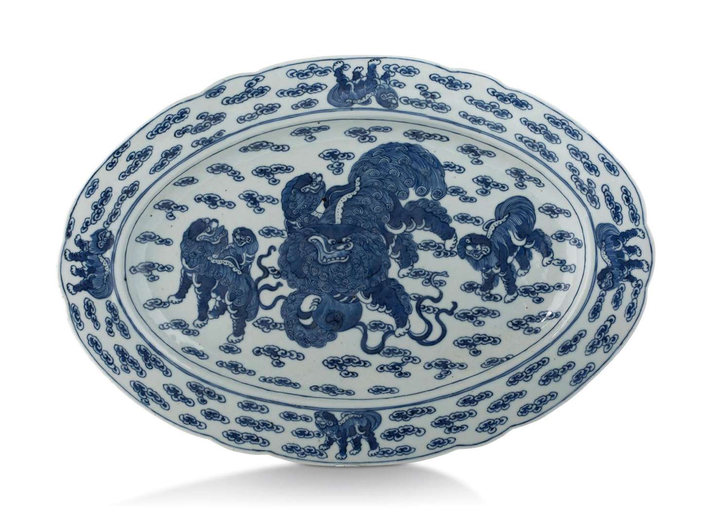 Important plat ovale en porcelaine bleu-blanc à décor de neuf chiens de Fô parmi les nuages stylisés. Le revers de l'aile décoré de chauve-souris voletant. Marque Jin Tang Fa