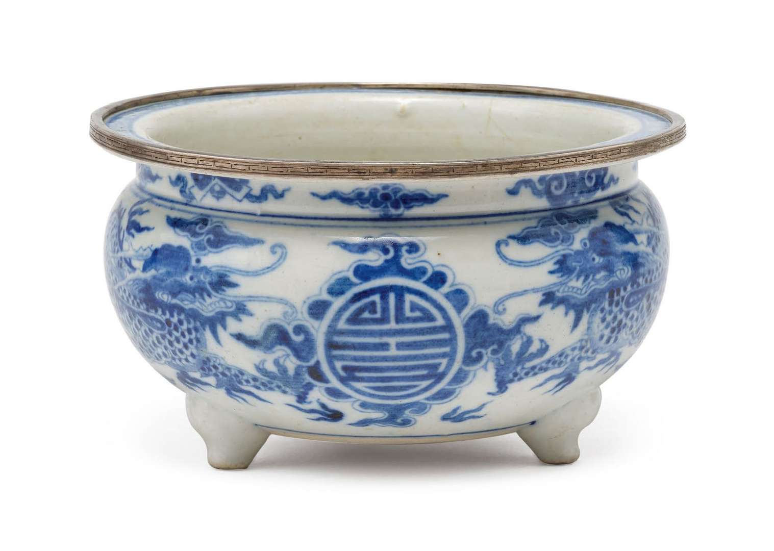 Important brûle-parfum tripode en porcelaine bleu-blanc, la panse légèrement aplatie décorée de deux dragons à cinq griffes encadrant un caractère de longévité stylisé, parmi les nuages et les flammes. La lèvre cerclée de métal.