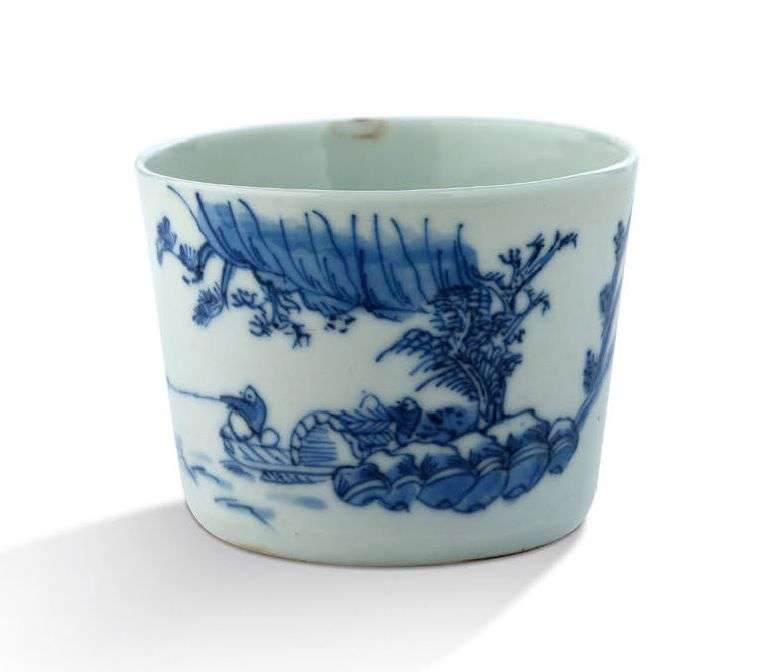 Coupe en porcelaine bleu-blanc décorée d'une falaise surplomblant deux pêcheurs sur un bateau, au loin la lune et des oiseaux, quelques vers faisant référence à la saison automnale et au départ des oies sauvages. Marque à deux caractères en bleu sous couverte sur la base.