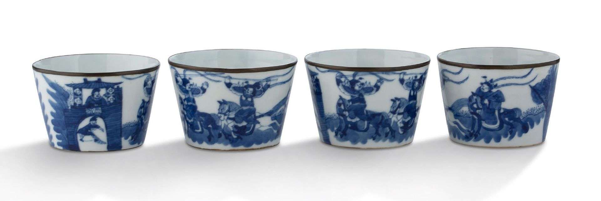 Ensemble de quatre coupes à vin en porcelaine bleu-blanc décorée de cavaliers bataillant devant une forteresse. La lèvre cerclée de métal. La base avec une marque à quatre caractères dans un double-carré en bleu sous couverte.