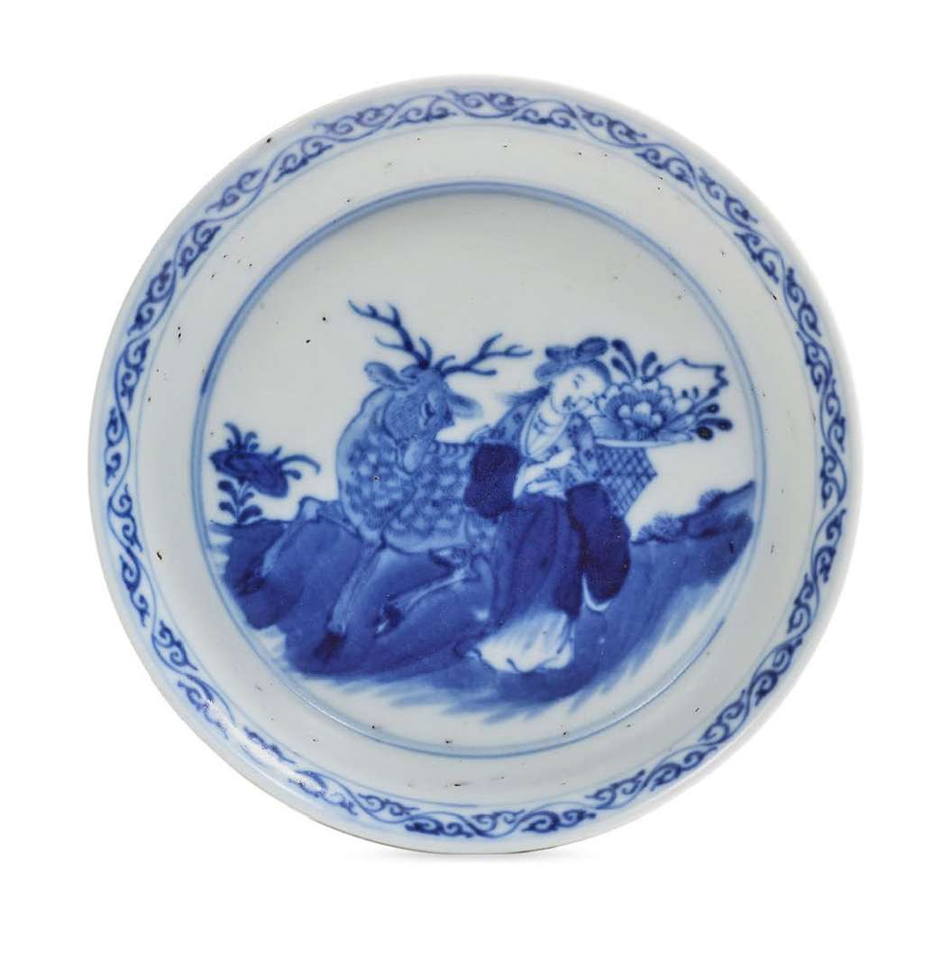 Petit plat en porcelaine bleu-blanc, le décor central représentant l'immortelle taoïste