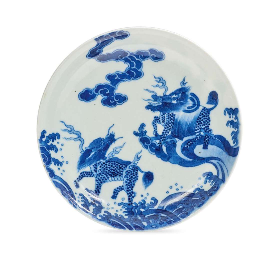 Petit plat en porcelaine bleu-blanc à décor de deux Qilin parmi les flots jaillissants et les nuages stylisés. Le revers de l'aile également décoré de Qilin parmi les flots.