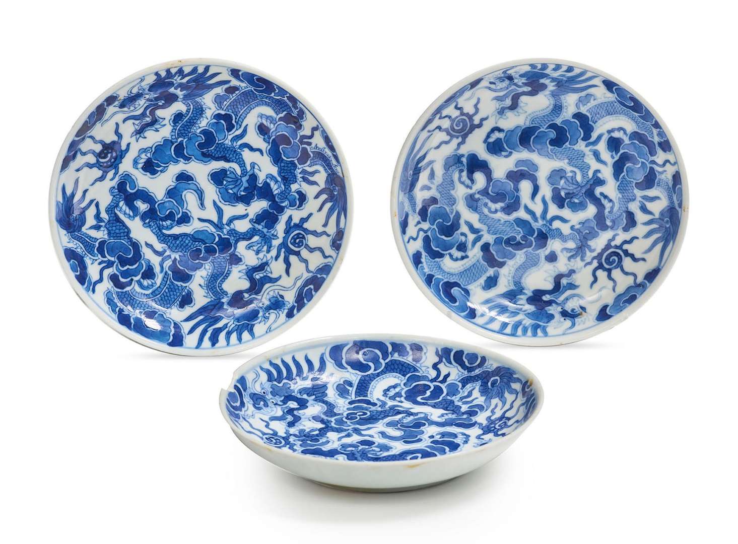 Ensemble de trois petits plats en porcelaine bleu-blanc à décor chacun de deux dragons à cinq griffes pourchassant la perle sacrée parmi les nuées. Marque à quatre caractères