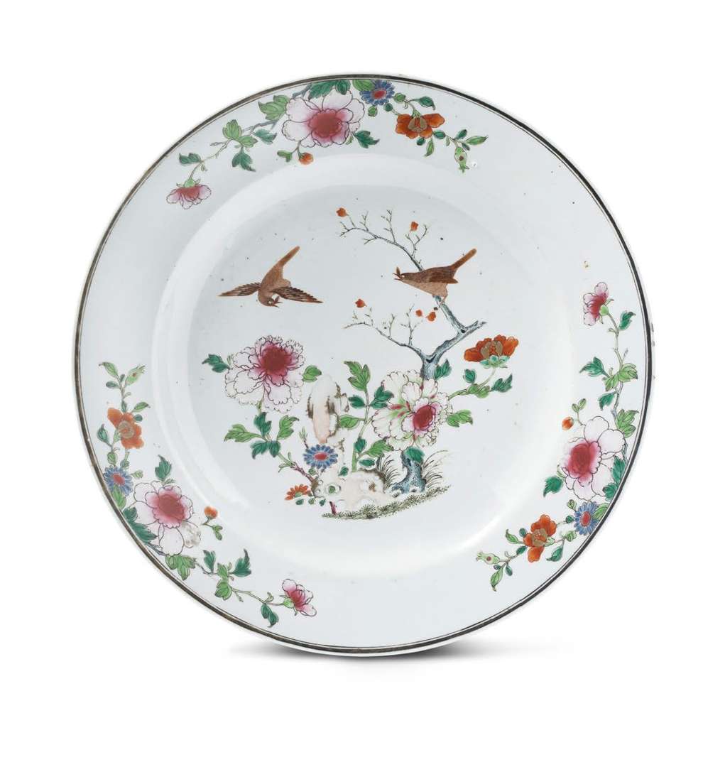 Plat circulaire en porcelaine et émaux de la famille rose, orné d'une composition figurant deux oiseaux bulbul parmi les pivoines et les rochers, l'aile librement décorée de pivoines et fleurettes.