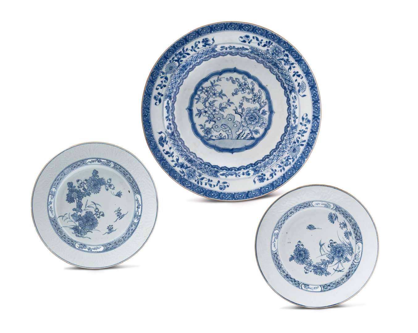 On y joint une paire d'assiettes circulaires en porcelaine bleu-blanc et émaux bianco-soprabianco, ornées de fleurs parmi les rochers.