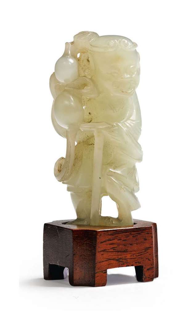 Sujet en jade céladon pâle sculpté représentant l'immortel taoïste Li Tieguai, appuyé sur sa canne et tenant dans la main gauche une gourde d'où s'échappent des volutes stylisées. Avec son socle en bois.