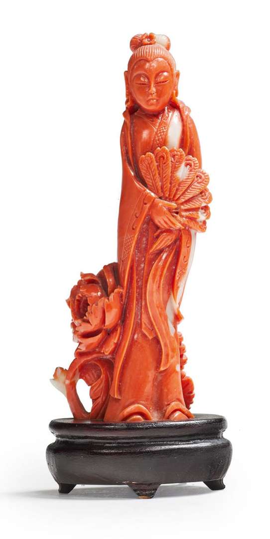 ~ Statuette en corail rouge orangé infusé de blanc représentant une élégante jeune femme tenant un éventail en plumes de paon dans la main gauche, un ensemble de fleurs s'épanouissant sur son côté droit. Socle en bois.
