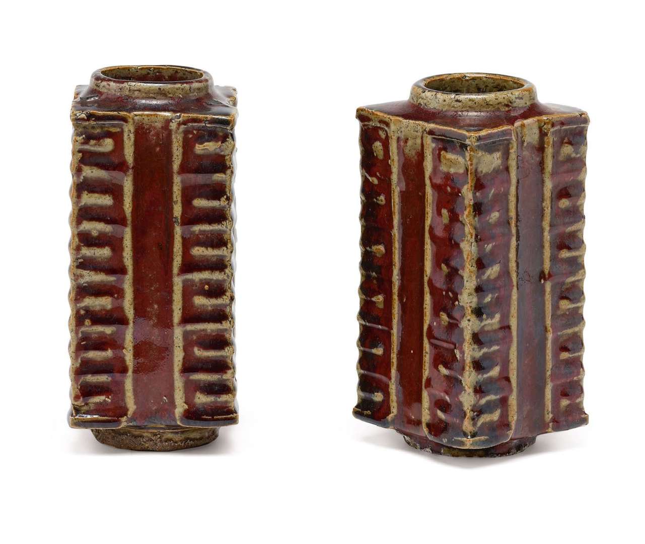 Paire de vases de forme Cong en grès émaillé sang-de-boeuf et beige reposant sur un court pied circulaire.~
