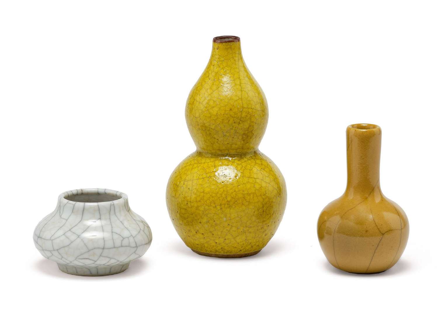 Ensemble comprenant un petit pot à eau à couverte de type Ge, un vase miniature à couverte monochrome chamois craquelée et une double-gourde à couverte monochrome jaune craquelée.