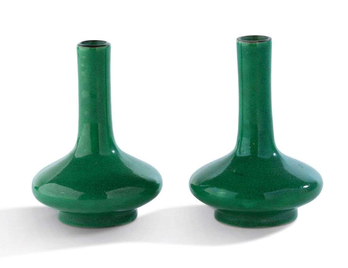 Paire de vases miniatures en porcelaine émaillée monochrome vert craquelé à l'imitation du verre de Pékin, la panse aplatie reposant sur un court pied circulaire et surmontée par un long col tubulaire.
