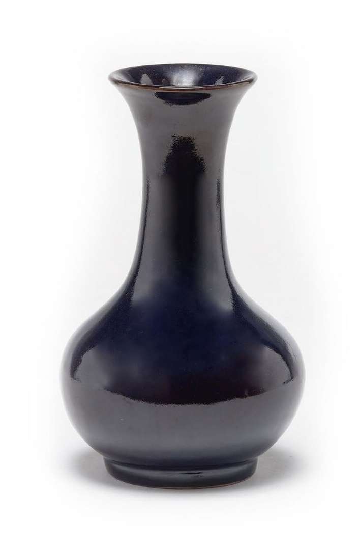 Vase en porcelaine à couverte monochrome aubergine, reposant sur un court pied circulaire, la panse globulaire légèrement aplatie se poursuivant en un long col évasé.