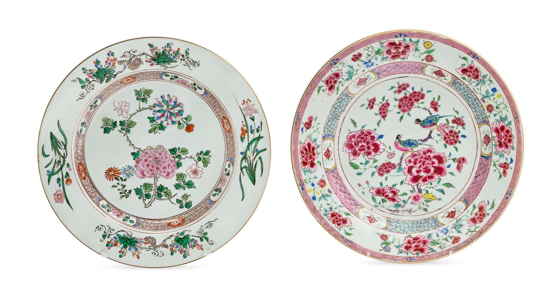 Deux assiettes en porcelaine et émaux de la famille rose, l'une décorée d'oiseaux parmi les pivoines et frises de pivoines, l'autre avec des pivoines et une frise alternée de lys et écureuils parmi les raisins.