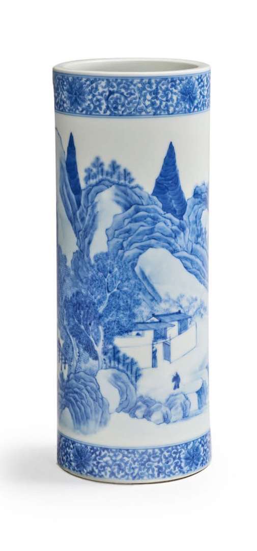 Vase cylindrique en porcelaine bleu-blanc, la panse à décor d'un paysage montagneux.