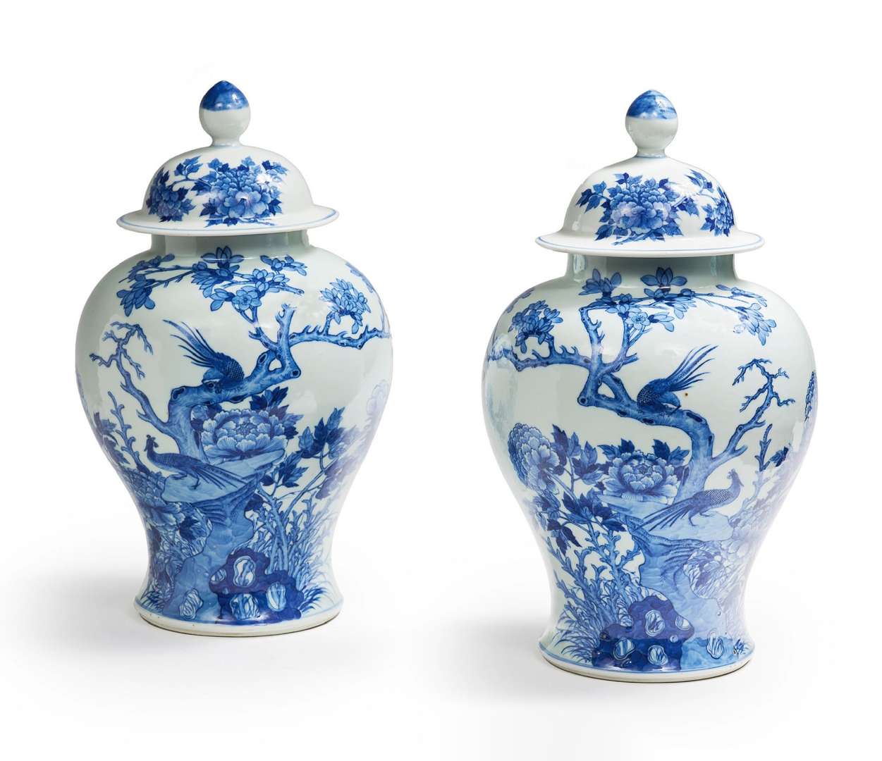 Importante paire de potiches couvertes en porcelaine bleu-blanc, la panse décorée d'une composition représentant deux phénix sur un large magnolia en fleurs, entourés par de grandes pivoines épanouies. Le couvercle avec une pivoine et son feuillage. La base avec un double-cercle en bleu sous couverte.