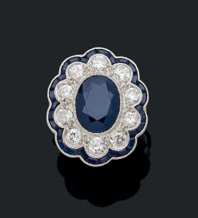 Saphir ovale, saphirs calibrés et diamants taille ancienne