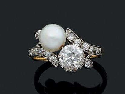A pearl, diamond, gold and platinum ring