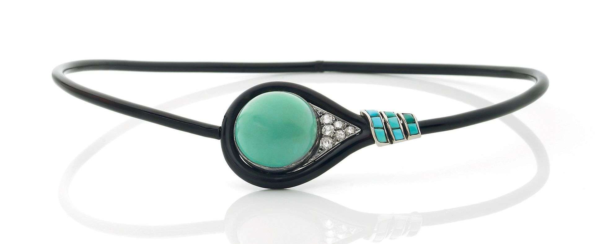 les domaines de l’art et la joaillerie n’échappait pas à cet engouement. Imaginons un instant que ce collier s’en inspire et qu’il évoque l’oeil d’Horus, le tour de cou émaillé de noir évoquerait le khôl qui farde les yeux de personnages représentés dans l’iconographie égyptienne antique. L’emploi de la turquoise crée un contraste intéressant et apporte une