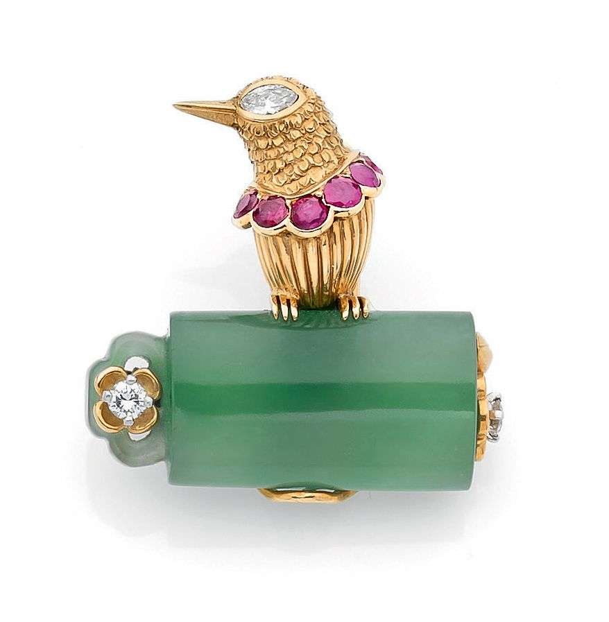 A jade, diamond, ruby and gold clip, signed