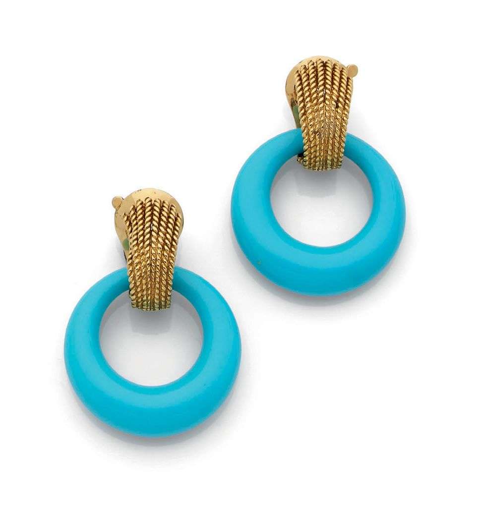 Turquoise, chalcedony and gold earrings, signed