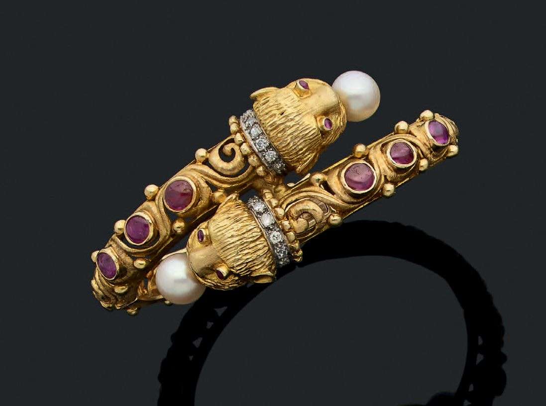 Perles de culture, rubis cabochons, diamants taille brillant