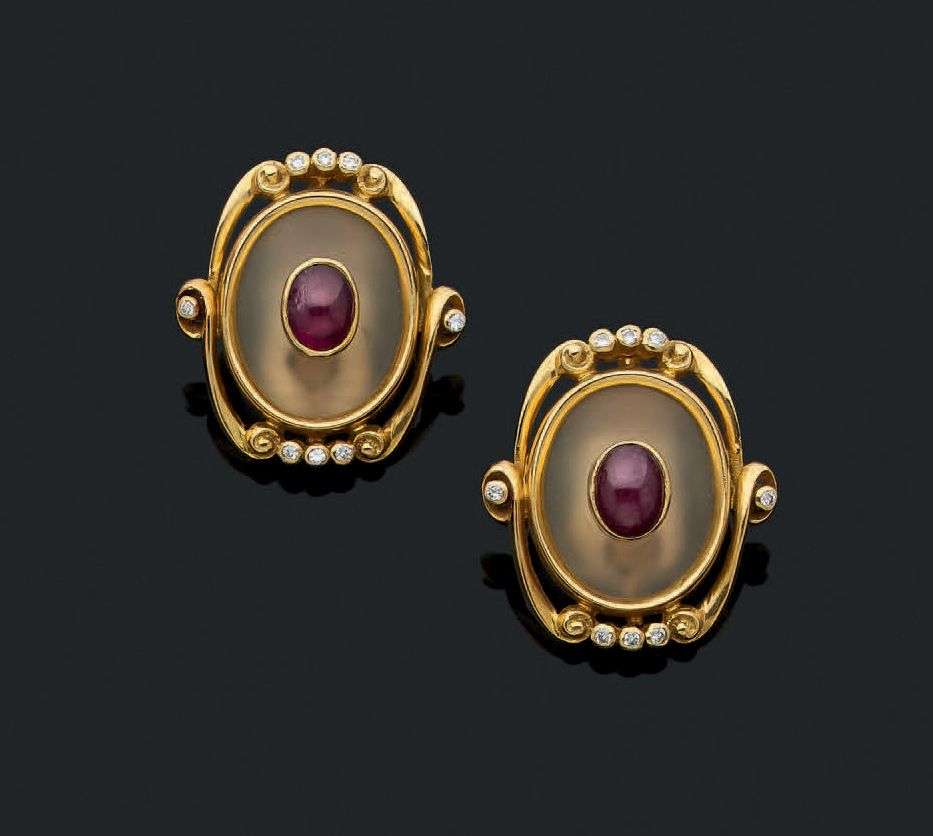 A rock crystal, ruby, diamond and gold earrings, stamped Lalaounis