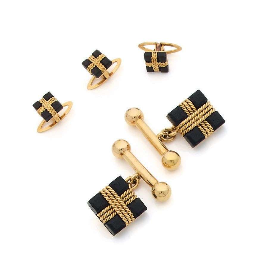 PAIRE DE BOUTONS DE MANCHETTES ET PLASTRON Ébène, or 18k (750)