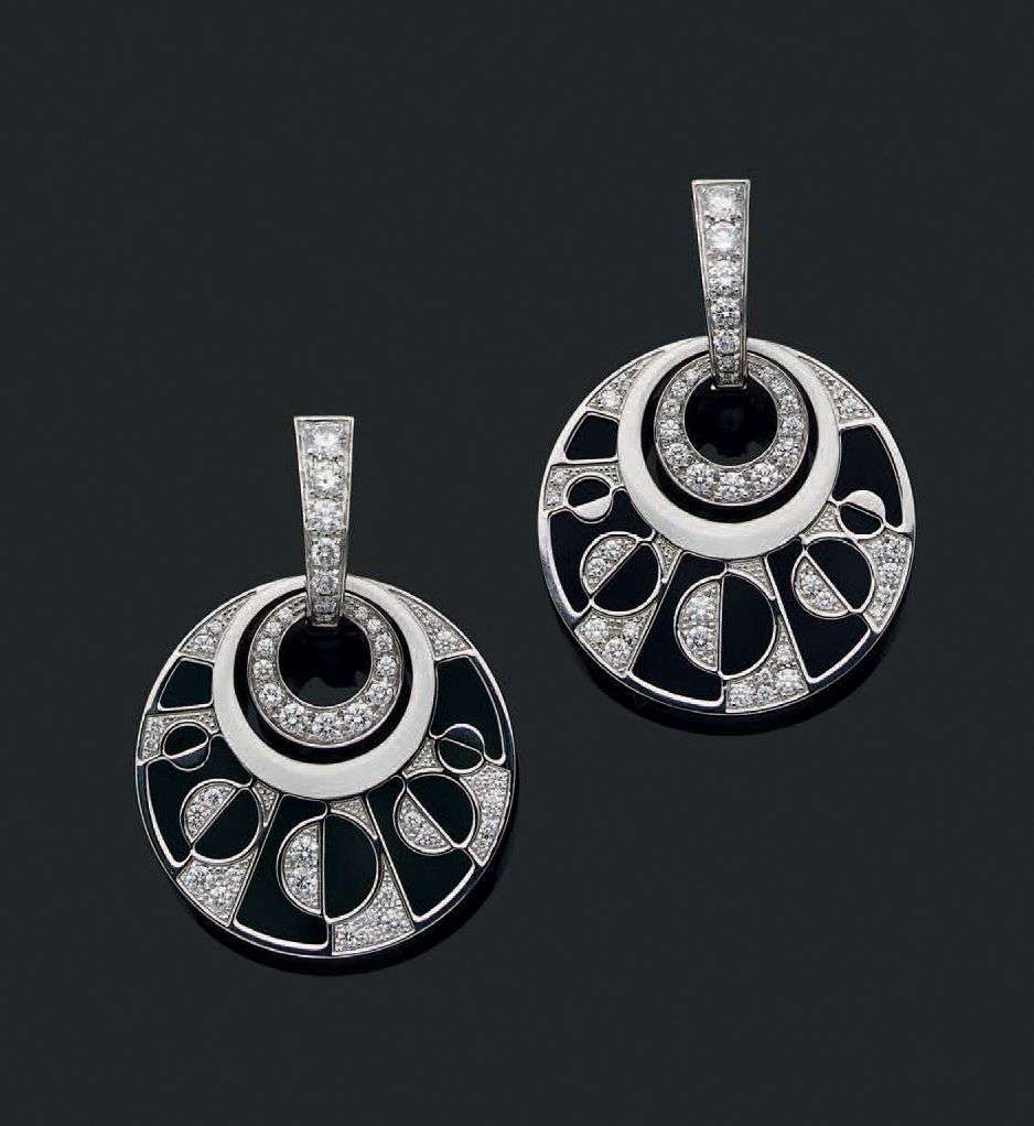 PAIRE DE PENDANTS D'OREILLES ET BAGUE Onyx et diamants taille brillant