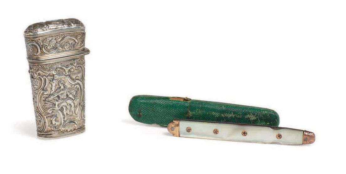 On y joint un nécessaire de voyage en argent comprenant des petits ustensiles divers. XVIIIe siècle.