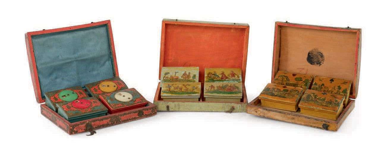 TROIS COFFRETS À JEUX DE QUADRILLE à âmes de bois et décor en vernis europ