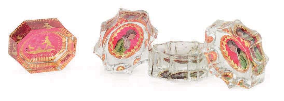 LOTS DE QUATRE SALERONS en verre taillé, une paire au portrait peint en fixé sous verre d'un homme et de son épouse. Une autre à décor d'un chasseur et son chien gravé à la roue au dessous, réhauts d'or et verre teinté rouge. Fin du XVIIIe siècle, début du XIXe siècle.
