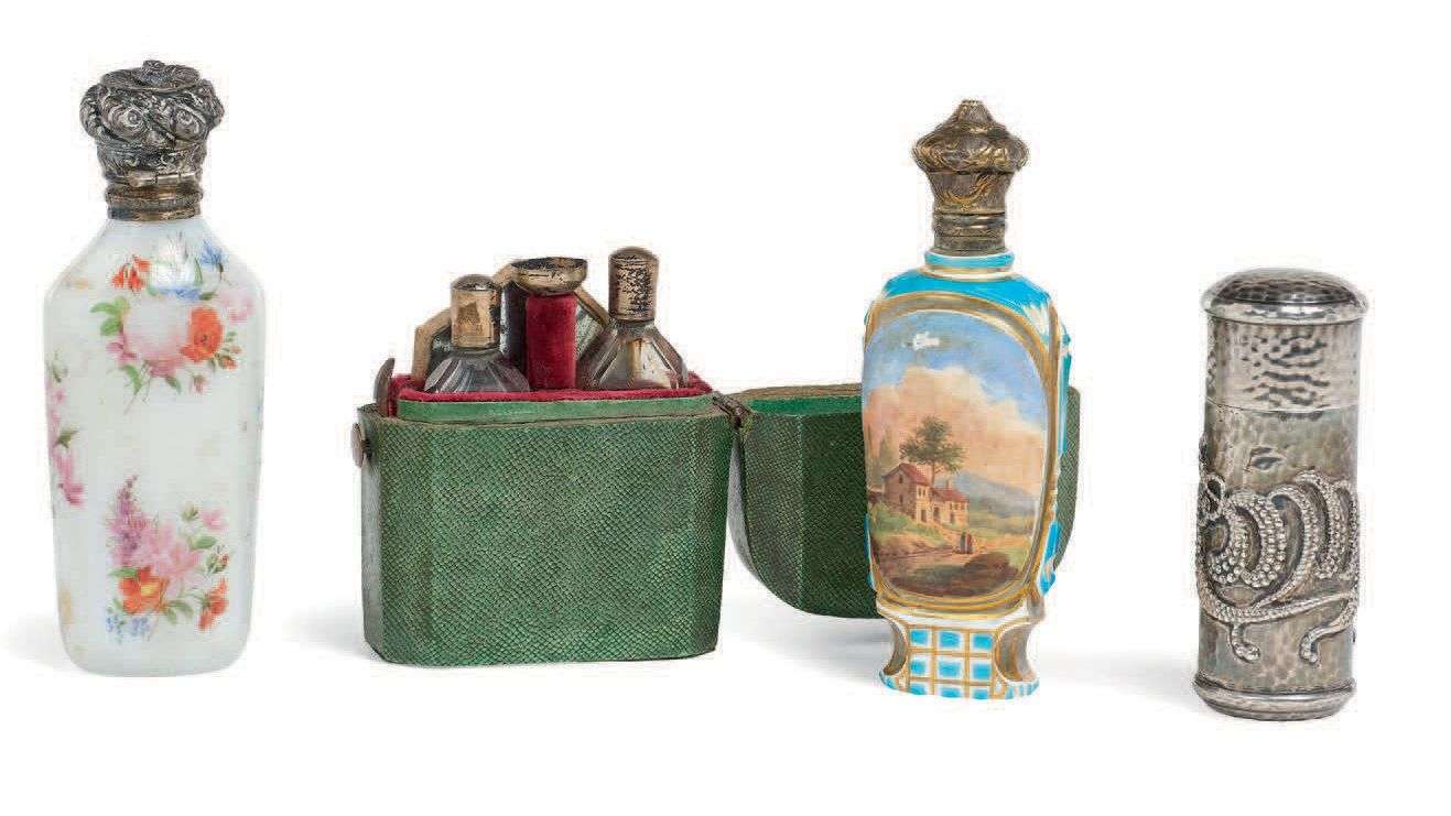 LOT DE TROIS FLACONS À SELS le premier en opaline à décor de fleurs, le deuxième en verre peint et émaillé à décor de paysage, le troisième en métal argenté. XVIIIe et XIXe siècle.