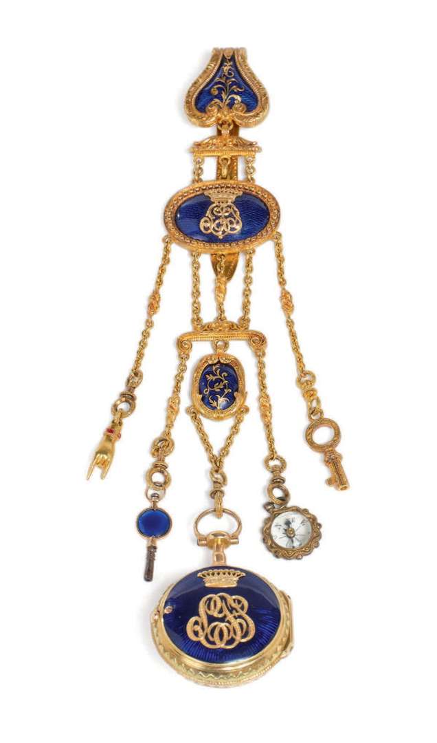 CHÂTELAINE en or jaune, la monture ornée d'un monogramme surmonté d'une couronne de comte sur un fond bleu émaillé dans des cartouches. La monture retient quatre chaînes d'où sont suspendues deux clés, une pendeloque d'or et une boussole en laiton (rapportée). La montre à gousset présente un cadran émaillé blanc. Les heures et les quarts d'heure en chiffres romains. Poinçon tête d'aigle et maître orfèvre (illisible). France, XIXe siècle.