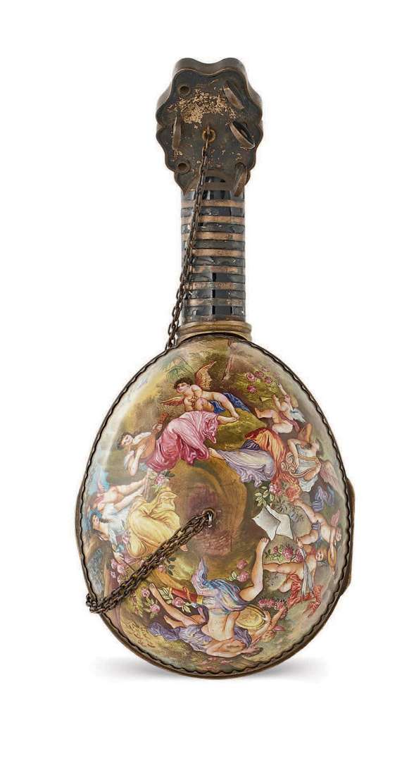 BOÎTE EN MANDOLINE en argent et émail polychrome. La table de l'instrument offre une montre dans un entourage de grotesques aux enfants. Le Fond de l'instrument représente un scène de personnages musiciens. Le fond s'ouvre dévoilant un intérieur richement décoré de rinceaux fleuris. Probablement Autriche, XIXe siècle.