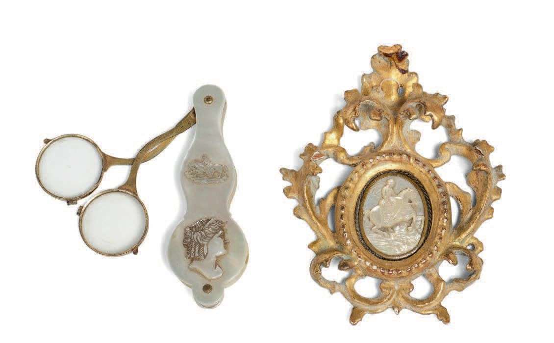 LOT DE NACRE composé d'un petit médaillon en nacre sculpté en bas relief représentant une jeune cavalière dans un cadre en bois doré de style baroque et d'une paire de bésicles en nacre. XIXe siècle.