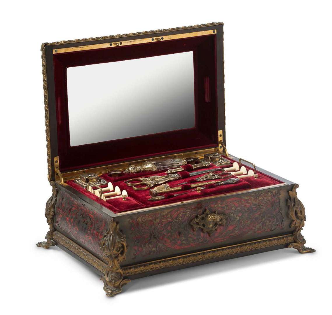 NÉCESSAIRE DE DAME conservé dans un coffret à doucine entièrement marqueté de laiton sur fond d'écaille rouge de rinceaux et d'enroulements feuillagés. Intérieur pourvu d'un miroir et garni de velours rouge. Il comprend deux dévidoirs en écaille enrichis d'or rose, six autres en ivoire marin, un flacon à sels en verre taillé et vermeil, un encrier et sablier en vermeil, deux paires de ciseaux, un étui à aiguilles, un porte-mine, un petit crochet à fil, un poinçon, un passe-fil en vermeil et un précieux dé à coudre en or jaune enrichi d'or vert et d'or rose finement ciselé. Maîtres orfèvres non identifiés, poinçons divers. Époque Napoléon III