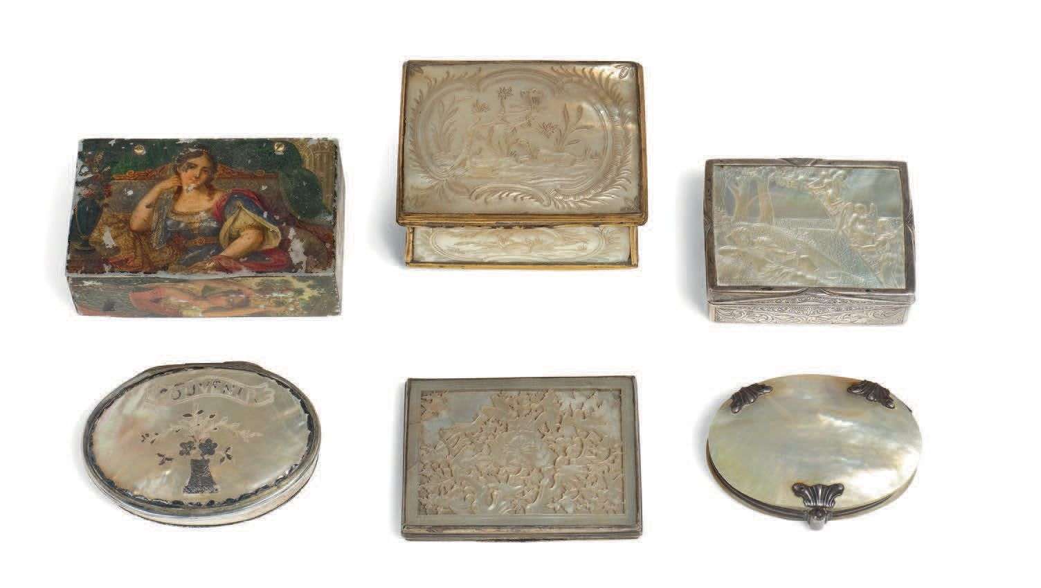 LOT DE CINQ BOÎTES en nacre. Quatre des coffrets en nacre sculptée, l'un figurant l'échelle de Jacob. Un des coffrets en nacre peinte toutes faces de portraits de jeunes femmes. XIXe siècle.