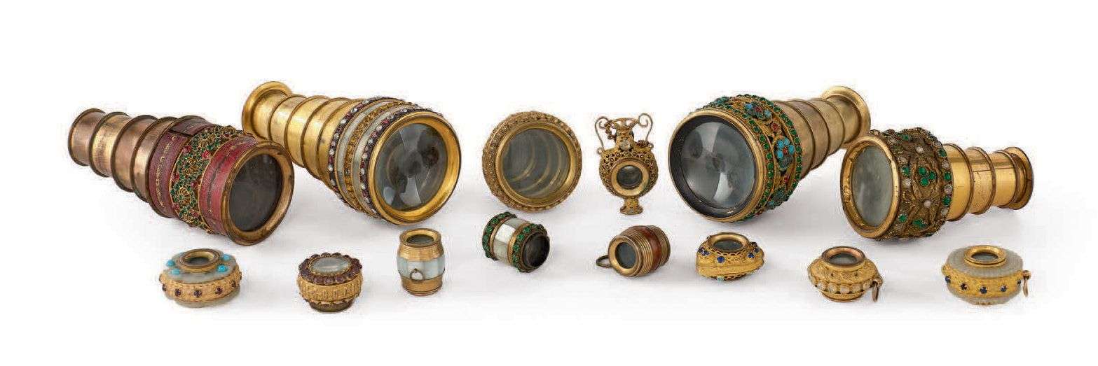 QUATORZE LORGNETTES de théâtre ou opéra en cuivre doré et laiton, toutes enrichies de nacre, pierreries et délicates fantaisies. Une signée de Chevallier ingénieur breveté du Roi à Paris. Première moitié du XIXe siècle.