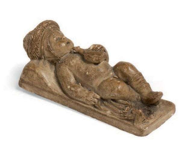 L'ENFANT IVRE petit et très fin groupe en terre cuite sur un socle rectangulaire où un enfant est allongé et dort tenant une gourde dans sa main gauche, un jouet arlequin à son côté, incisé au dos : «Gabriel Voynant fait d'après nature à Toulous le 16 janvier 1852 à 14 mois». Anneau de suspension originel.