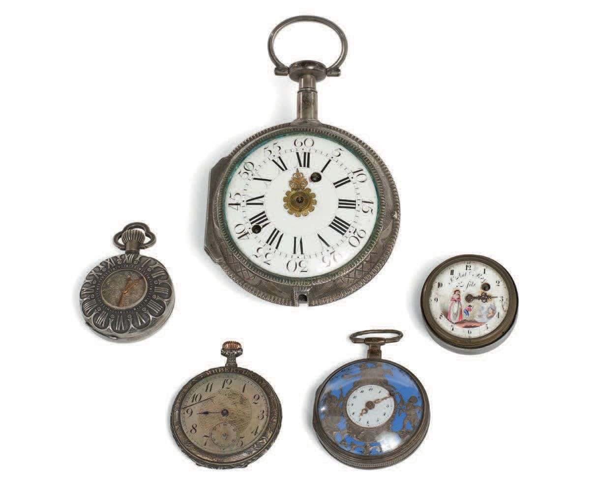 - une montre de poche en métal argenté, cadran en émail blanc décoré de deux personnages signé Rey et Fils.