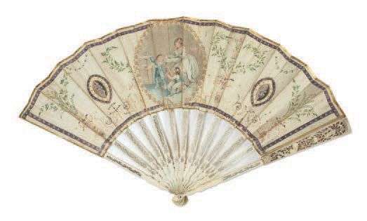 Lot composé de dix éventails dont neuf de papier gouaché et vélin sur âme d'os ajouré. Scènes diverses peintes et gravures selon. France, XVIIIe et XIXe siècle.