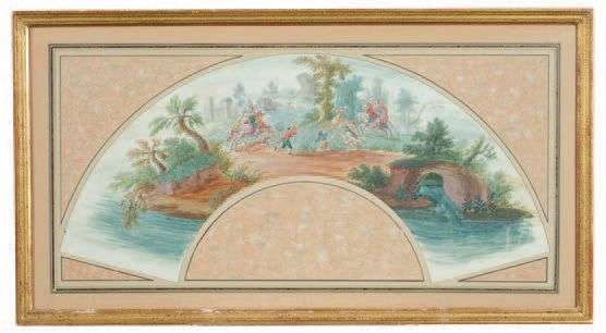 TROIS PROJETS D'ÉVENTAILS sur le thème de la chasse et de la vénerie. Trois chasses aux cerfs, deux chasses à tir. Gouache sur papier peint sur les deux faces. France, XVIIIe siècle.