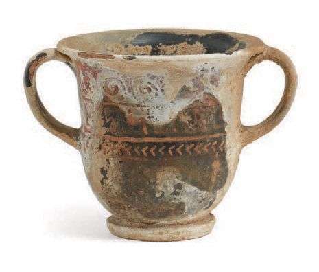 SKYPHOS en terre claire et figures noires de méandres différents sur chaque face. Deux anses latérales. Attique ou Grande Grèce, V - IVe siècle avant J.-C.