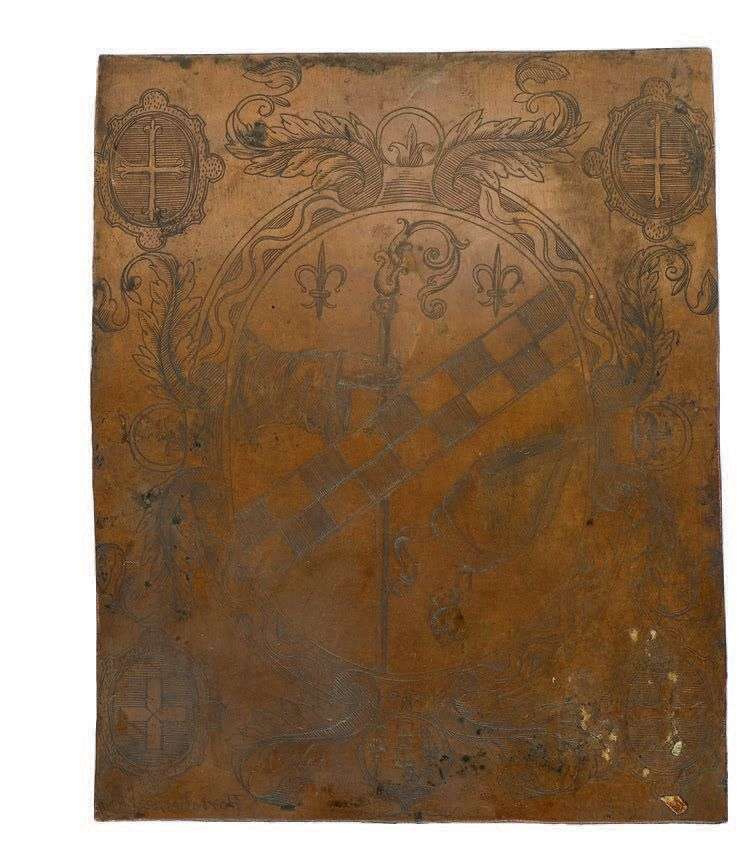 MATRICE D'EX LIBRIS en cuivre gravé d'armoiries (probablement une abbaye)
