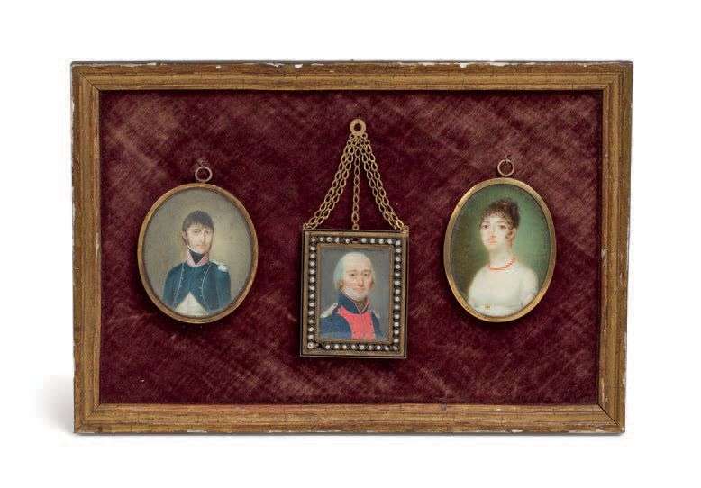 LOT DE TROIS MINIATURES peintes à la gouache représentant respectivement de gauche à droite : Jean-Jacques Nicolas Mougenot (1772 - 1836), Mathias d'Autrecourt (1757 - 1809) et Anne-Marie Julienne Lévêque (1787 - 1873) épouse Mougenot. Dans un cadre rectangulaire à fond de velours violet. Début du XIXe siècle.