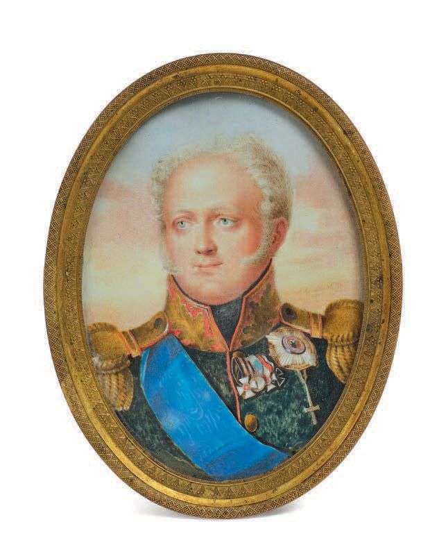 Portrait du Tsar Alexandre Ier en buste. Signé à droite «A. Rockstuhl fecit» et daté 1817. Gouache.