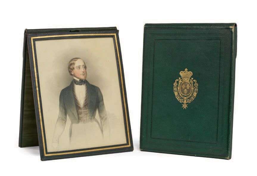 COMTE & COMTESSE DE CHAMBORD deux portraits en pendants représentant respectivement le comte et la comtesse de Chambord à l'aquarelle. L'un signé et daté 1847. Dans des étuis de cuir vert aux armes de France par Berthet et Perret, 13 rue Montmorency au Marais. Début du XIXe siècle.
